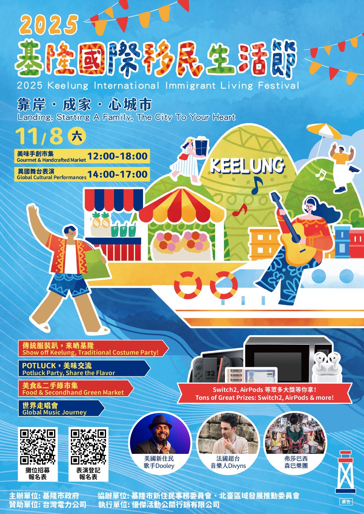 Nakatuon ang 2025 Keelung International Immigrant Life Festival sa paggunita sa kasaysayan at paghubog ng hinaharap. Sa pamamagitan ng "Kilusang 399+1 " sumasagot sa serye ng mga aktibidad sa 2026 "Mobile Port, Keelung ng Mundo" pang- 400 taon, na nag-uugnay sa kontekstong pangkasaysayan at nagpapakita ng pagpapatuloy at pagkakaiba-iba ng kulturang imigrante sa pag-unlad ng lungsod. Gaganapin ang aktibidad sa Nobyembre 8, 2025 (Sabado) sa Keelung Bus Terminal (No. 5 Gangxi St., Distrito ng Renai, Lungsod ng Keelung). Iniimbitahang dumalo ang lahat ~ Oras ng Aktibidad: Pagkain at Likhang-Kamay sa Tiangge 12:00 – 18:00 Pagtatanghal ng Sayaw ng iba’t ibang bansa 14:00 – 17:00 Mga Katangian ng Aktibidad: Mga tradisyonal na kasuotan, may POTLUCK party, tiangge ng pagkain at second-hand na gamit. Inimbitahang magtanghal sina Dooley, bagong imigranteng manganganta mula sa Amerika; Divyn, manganganta mula sa France at ang Brazilian Samba Group, at mayroon pang gantimpalang Switch2, Airpods at iba pa ~